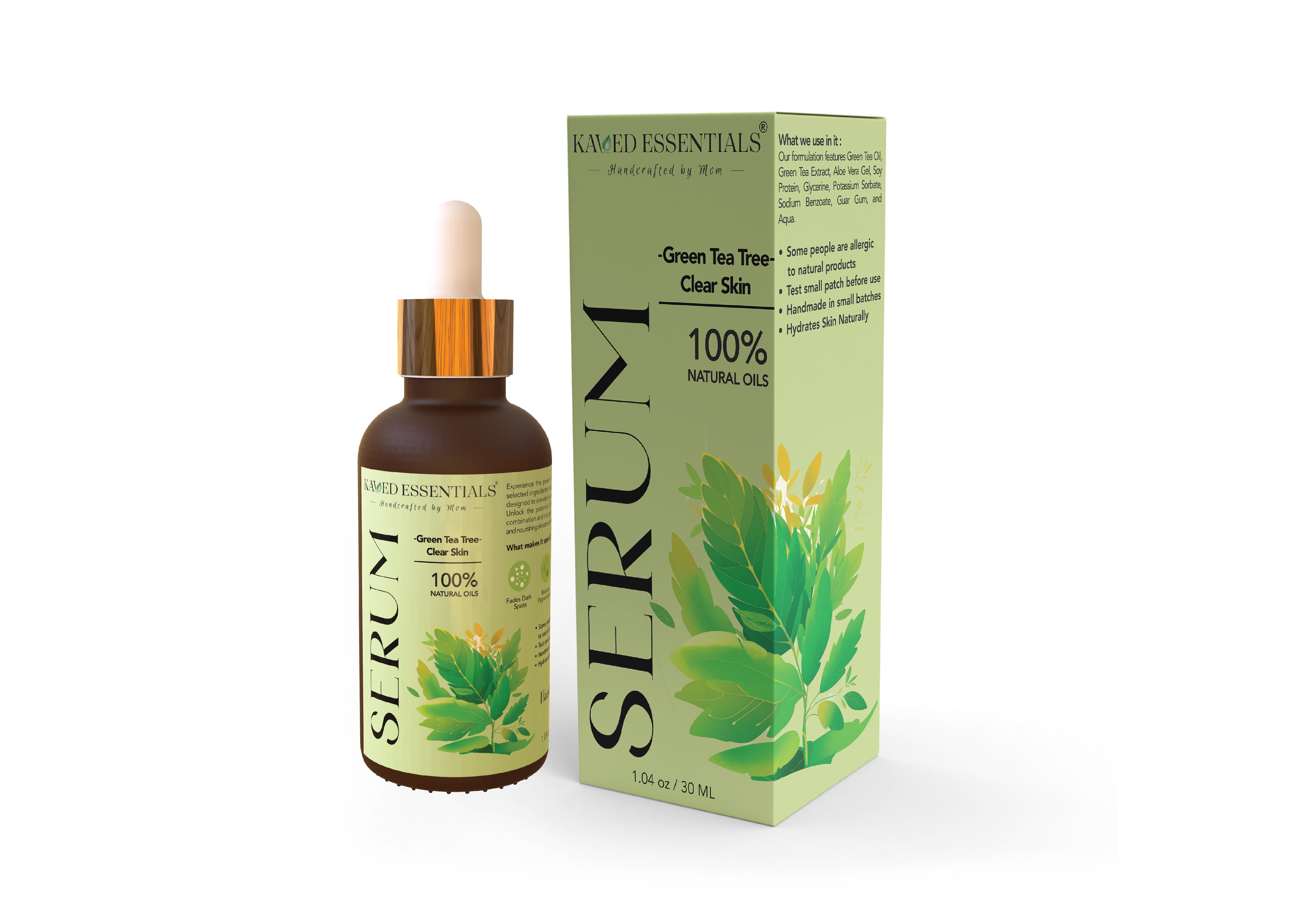 Kaved Essentials GREEN TEA FACE SERUM - (30ML) Hydrating & moisturise the skin. It helps in - CLEARING OUT ACNE & ACNE MARKS -MAKE YOUR SKIN BRIGHTER & GLOWING -REDUCES FINE LINES,DARK SPOTS & PIGMENTATION. GREEN TEA IS KNOW FOR ITS CALMING EFFECTS. THIS SERUM IS INCORPORATED WITH ALL OF ITS PROPERTIES ALONG WITH ITS SOOTHING AROMA -THAT CALMS THE SENSES. THE BLEND OF GREEN TEA AND VITAMIN C PRESENT IN THE SERUM HELPS IN REDUCING FINE LINES, DARK SPORTS & PIGMENTATION. Green tea face serum is rich in antioxidants and anti bacterial properties, soothing inflammatory skin and solving all the skin issues. It helps to promote healthy and radiant skin. 100 % chemical free & handmade with love. WHAT WE USE IN IT; GREEN TEA OIL, GREEN TEA EXACT, ALEOVERA GEL, VITAMIN-C, VITAMIN –E,SOYA PROTIEN,GLYCERINE,POTASSIUM SORBATE,SODIUM BENZOATE,GUAR GUM,AQUA.
