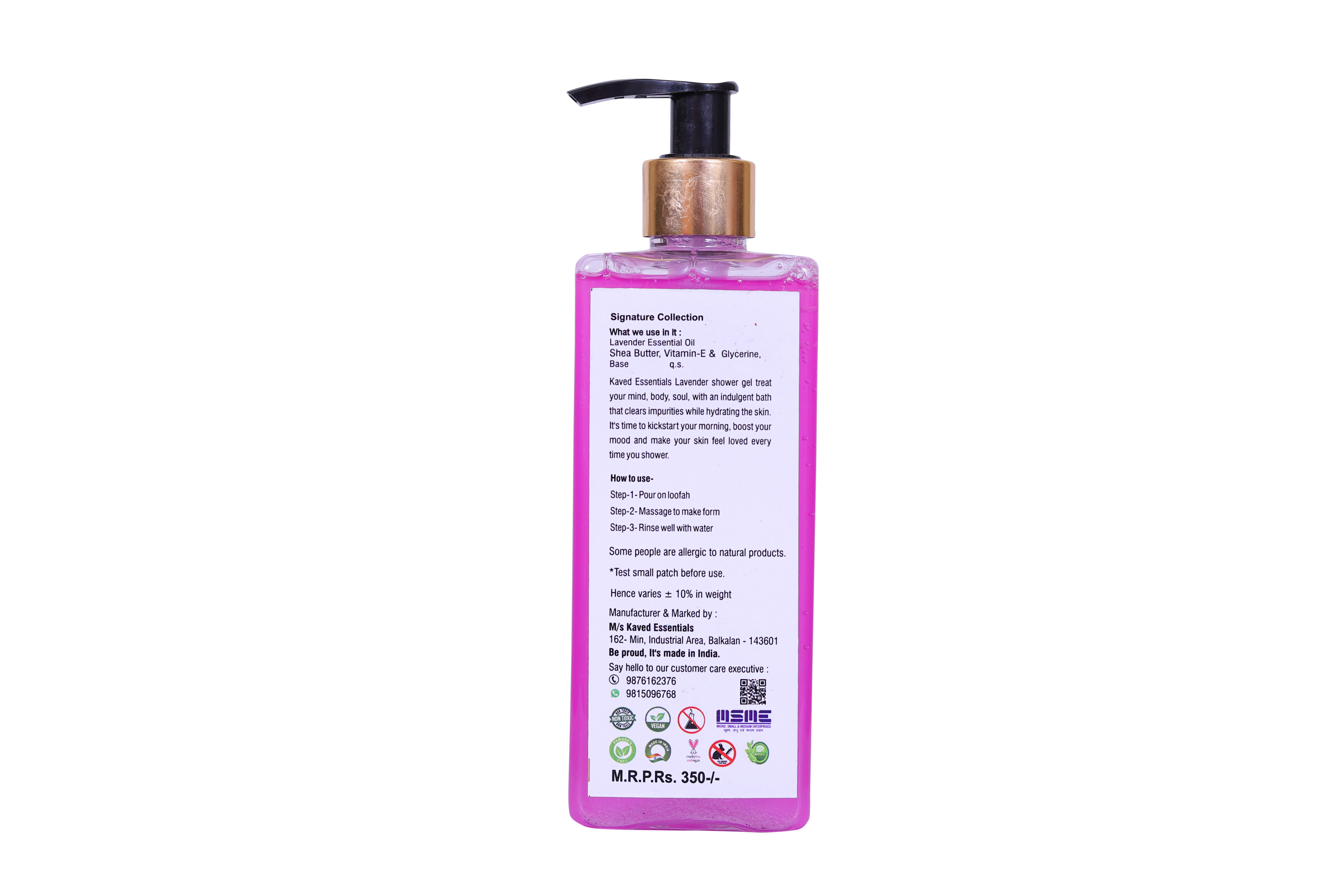 KAVED ESSENTIALS LAVENDER SHOWER GEL TREAT YOUR MIND, BODY,SOUL, WITH AN INDULGENT BATH THAT CLEARS IMPURTIES WHILE HYDRATING THE SKIN . IT”S TIME TO KICKSTART YOUR MORNING ,BOOST YOUR MOOD & MAKE YOUR SKIN FEEL LOVED EVERY TIME YOU SHOWER