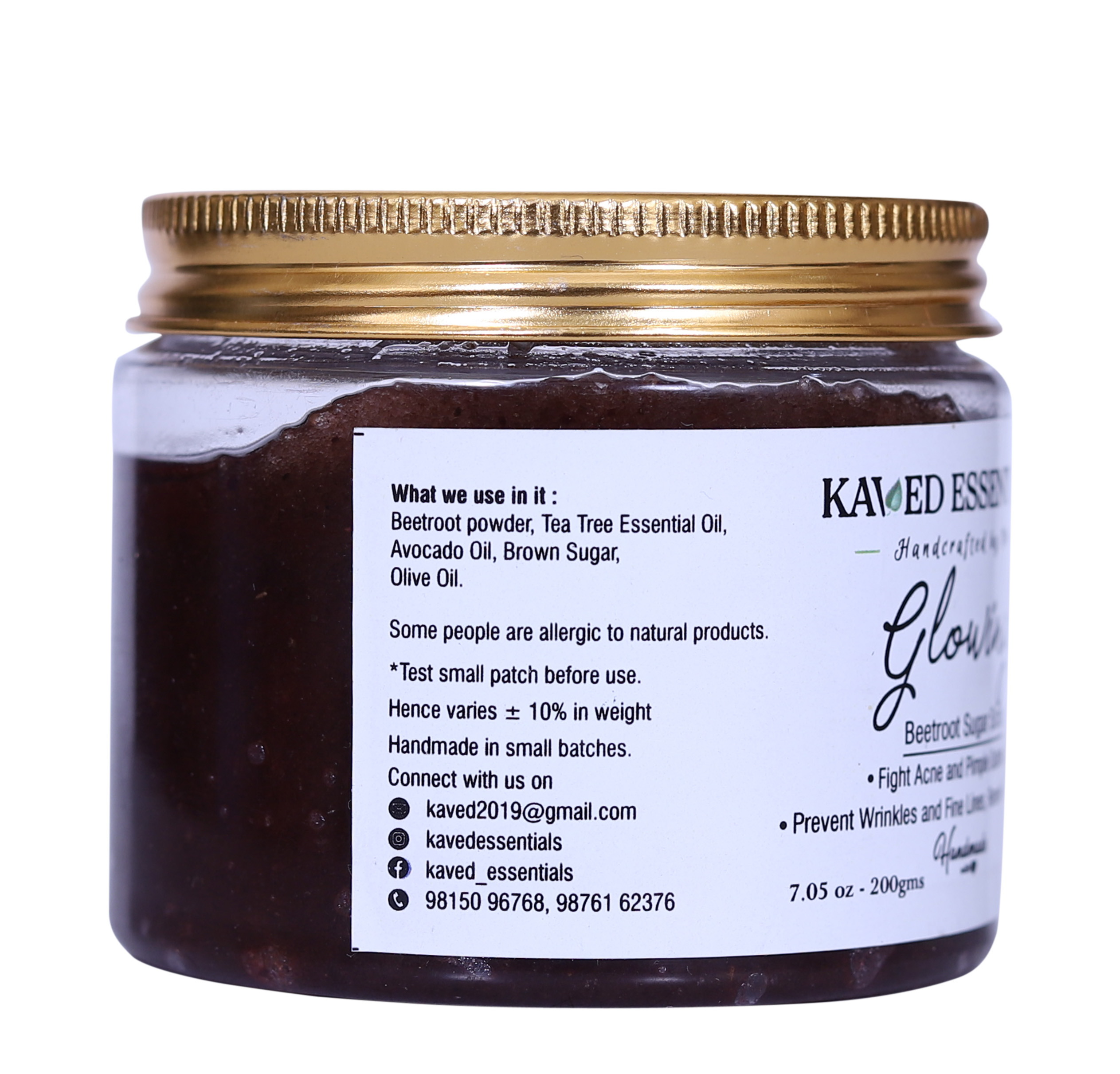 BEETROOT POWDER,TEA TREE ESSENTIALS OIL, AVACADO OIL, BROWN SUGAR, OLIVE OIL.